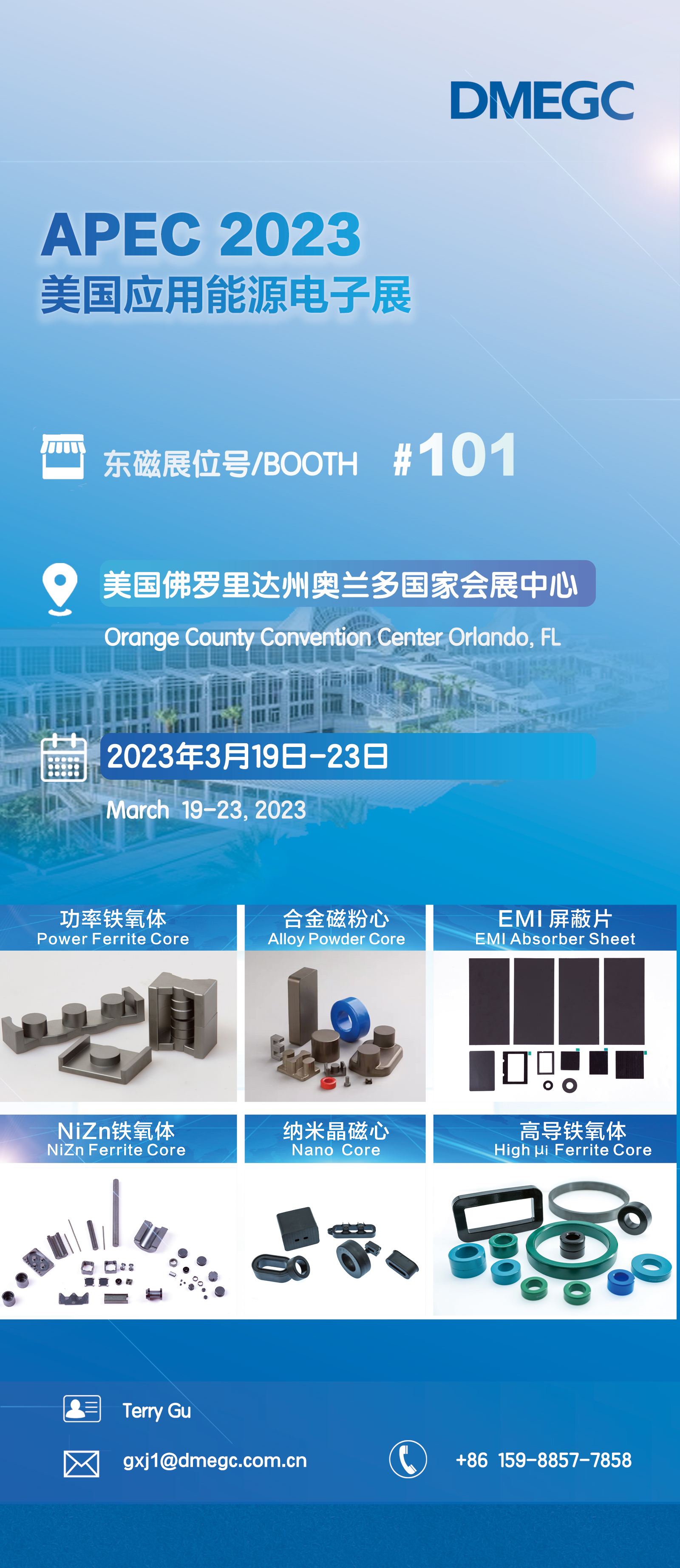 3月19日至23日,2023 APEC(美國應用能源電子展)將于佛羅里達州奧蘭多國家會展中心舉行。屆時,橫店東磁將攜多款軟磁材料新產品亮相101號展位,歡迎蒞臨參觀交流!