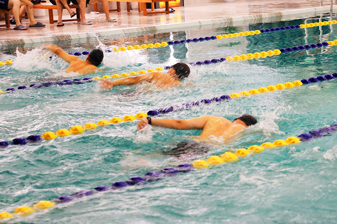 下午兩點,游泳館內人聲鼎沸,運動健兒們早已換上泳裝,蓄勢待發。只聽得一聲令響,游泳健將們迅速反應,矯健的身姿,如利箭出弦,你追我趕間,浪花翻涌。一場激烈的游泳比賽,瞬間火熱上演。